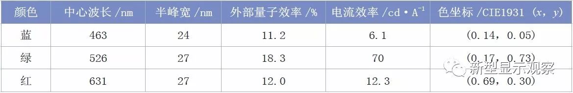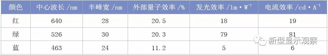 国内外有很多机构在进行量子点材料的开发,根据已经发表的成果,RGB(红绿蓝)三原色量子点材料的相关参数可参考表1。目前,绿色的转换效率最好,蓝色相对较差。